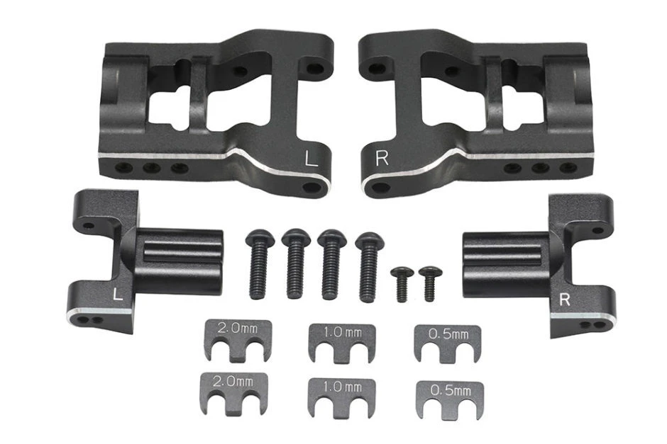 These are the new adjustable aluminium rear H-arms for the YD-2 and YD-4 series of drift cars. The multi-piece wishbones are slightly shorter than the standard parts for improved drift performance while included shims allow to fine-tune the car’s track width to ensure best possible adaption to various track conditions and driving styles. The sturdy alloy material makes for great precision and an optimised weight distribution with the arms being a direct fit on the YD-2EXII car but they require Y2-301D2 and Y2-301E2 rear alloy arm mounts as well as B8-301BS bushings for installation in all other YD-2 and YD-4 kits.